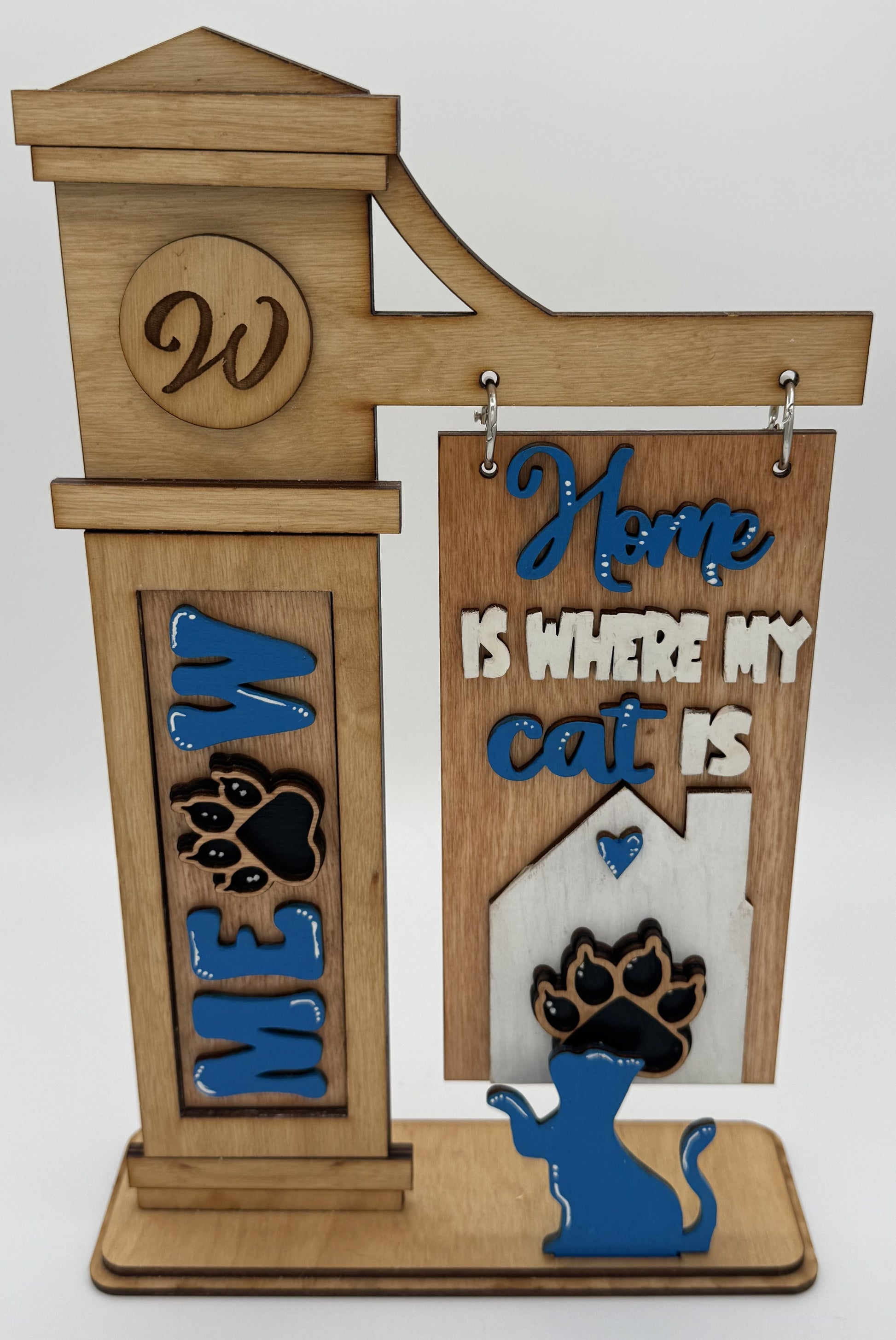 Bring a little love to your home this season with this charming home is where my cat(s) are insert. It features a cat home with beautiful white lettering. The accent is a playful cat. This kit can be Color/painted any way you like! It is perfect for adding a festive touch to your entryway, kitchen, office, classrooms, or any party setup. This insert is made to go into a signpost holder sold separately.