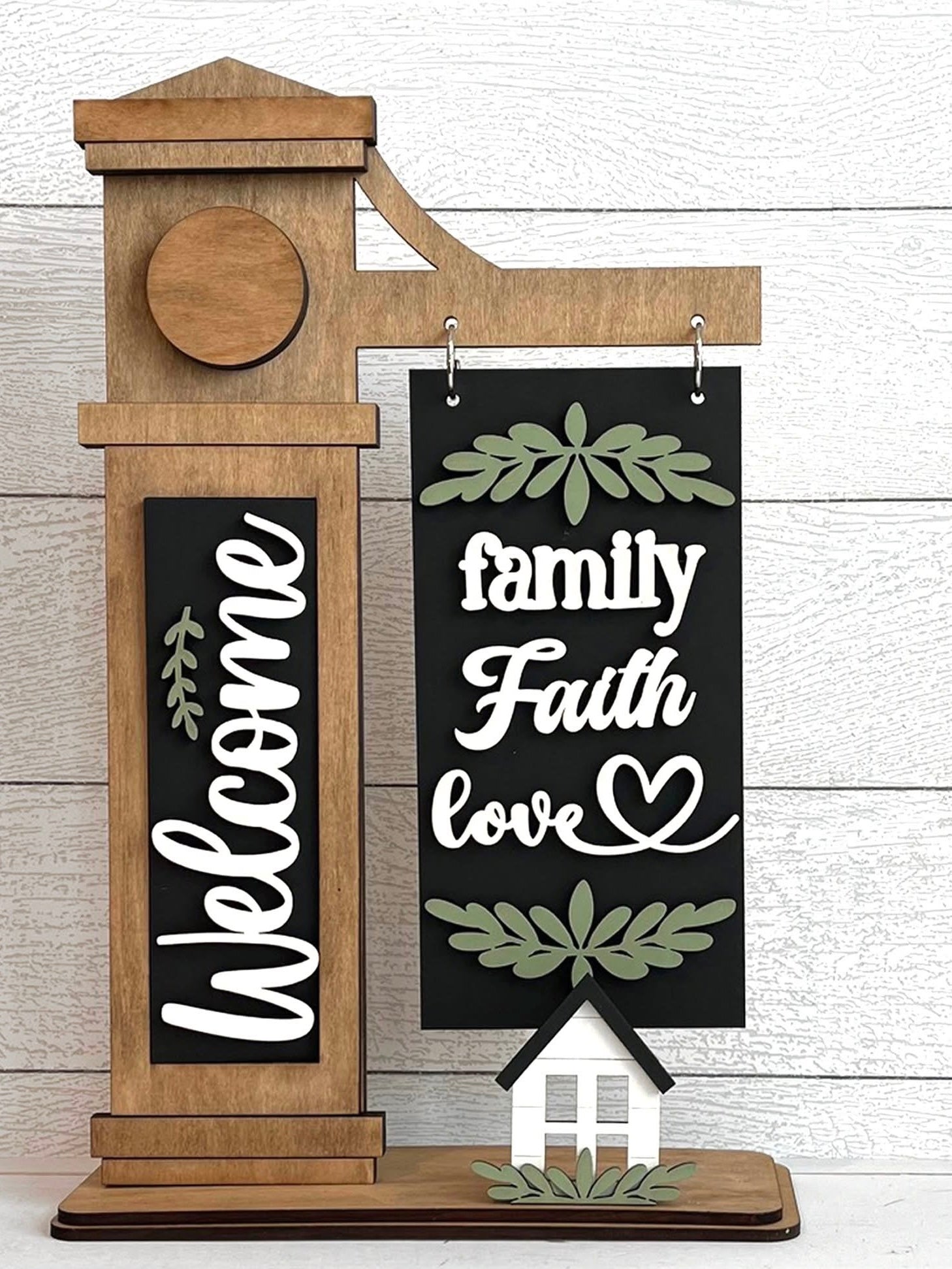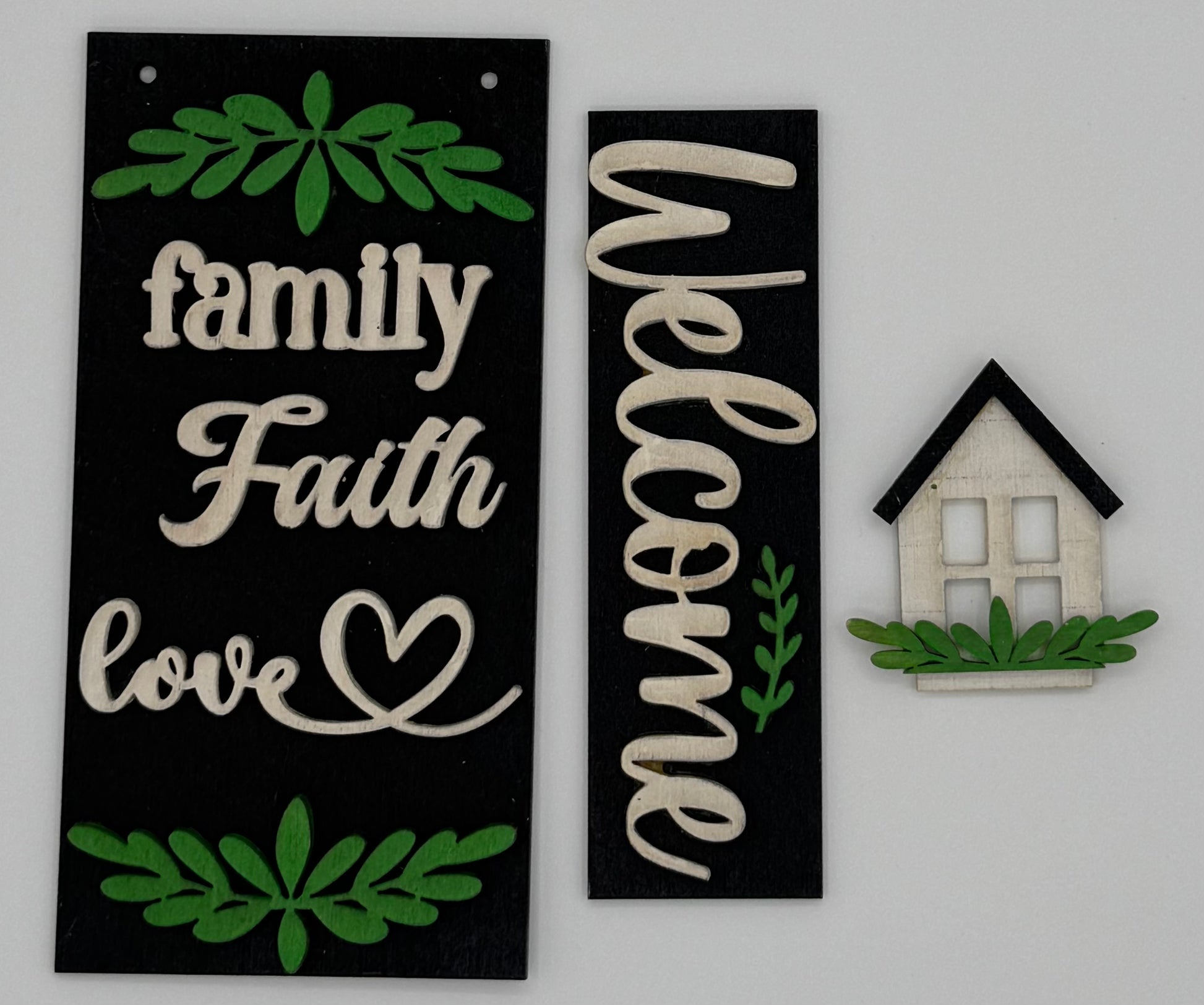 Bring a little love to your home this season with this charming Faith, Family, Love insert. It features a chalkboard back with beautiful white lettering. Green foliage on both inserts. The accent is a home. This kit can be Color/painted any way you like! It is perfect for adding a festive touch to your entryway, kitchen, office, classrooms, or any party setup. This insert is made to go into a signpost holder sold separately.